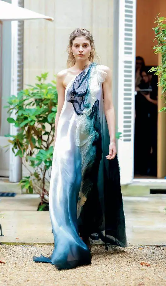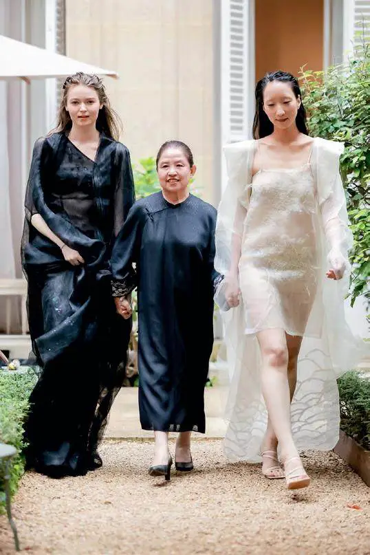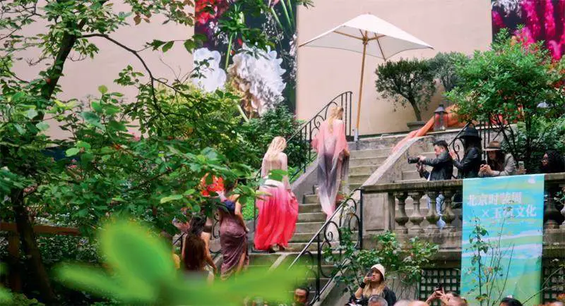 正是这种对空间意境的精心营造,为服装的展示奠定了独特的文化基调,中式时装的设计风格往往与秀场空间的意境之美相互映衬,空间感进一步提升了服装的文化格调和艺术价值。在李薇“玉见巴黎”系列中,服装从三江源的自然与文化中汲取灵感,将玉树岩画的典型图案、玉树牦牛绒等地域特色元素,以及传统手工彩色植物染、苏绣、织锦等非遗手工艺融入服装设计之中。这些带有浓郁东方文化印记的服装,在以自然元素为主导的秀场空间中展示,更能凸显其质朴的自然之美和深厚的文化底蕴。秀场空间的空灵与自然,反过来也衬托出服装的精致工艺和蕴含的生命力量。