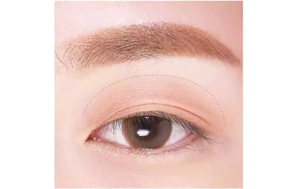 第一步:沾取淡橘色眼影画在图片内标示的虚线内。