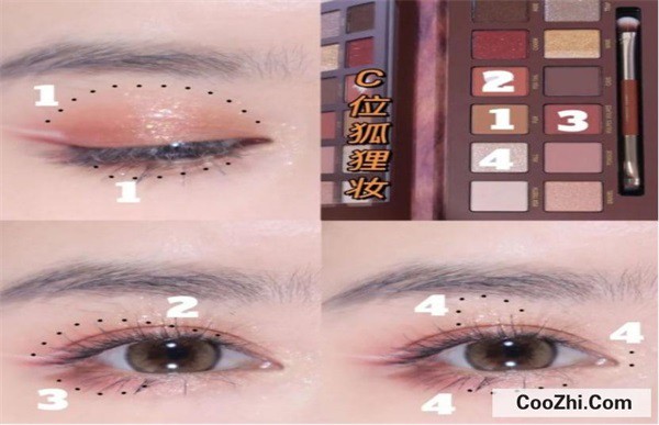 与素颜妆相反的妖媚狐狸妆则是使用下图的四个颜色,首先用一号色打底,二号色均匀涂抹在上眼皮和下至的位置,三号色用于加深下至,随后用四号色在眼中提亮即可。