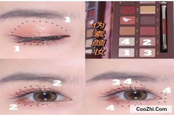 01伪素颜装需要下面四个颜色,首先用一号色进行打底,围绕眼周进行铺面,而二号色主要是化在眼头和眼尾的位置,三号色与四号色主要是高光效果,可以在眼皮中部随意涂抹。