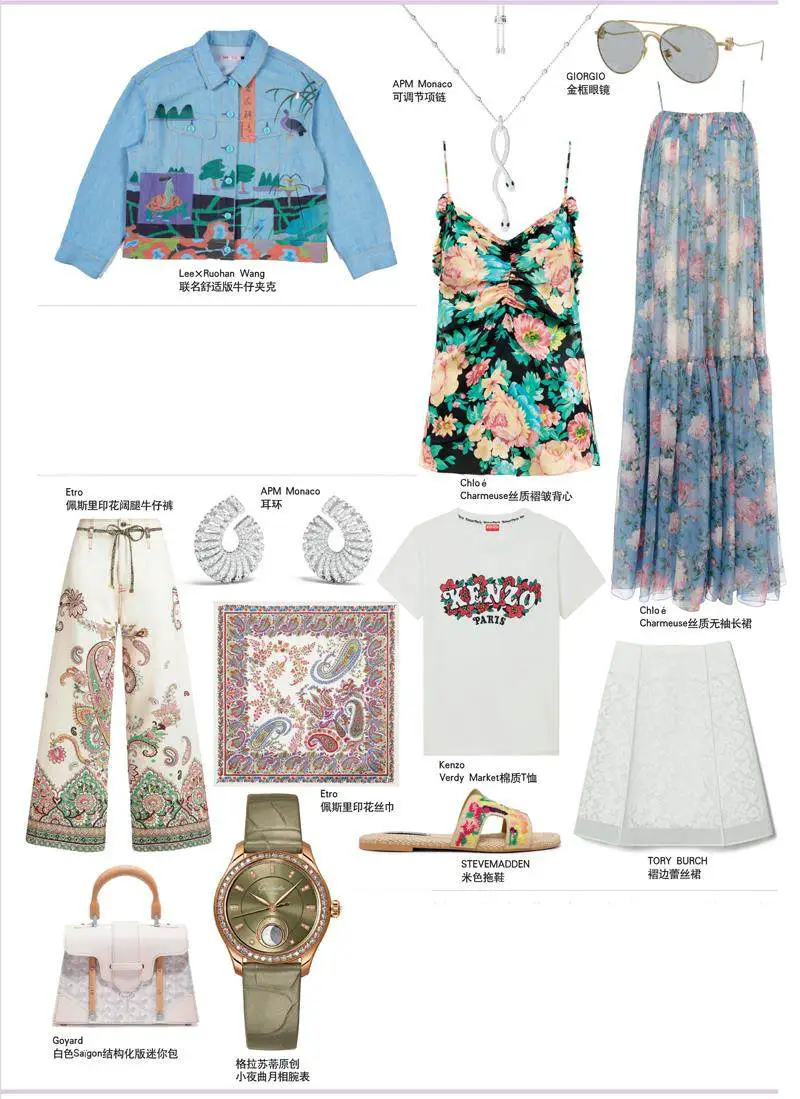 2.细节点缀对于极致花卉穿搭而言,同样能起到增色添彩的重要作用。整体造型巧妙地加入花卉元素的配饰,比如将一条印花丝巾随意地系在颈间,或是佩戴一对精致的花朵耳环,又或是手持一款带有花卉图案的手包,这些配饰都能成为整个造型的点睛之笔,极大程度地提升整体穿搭的精致感与层次感。