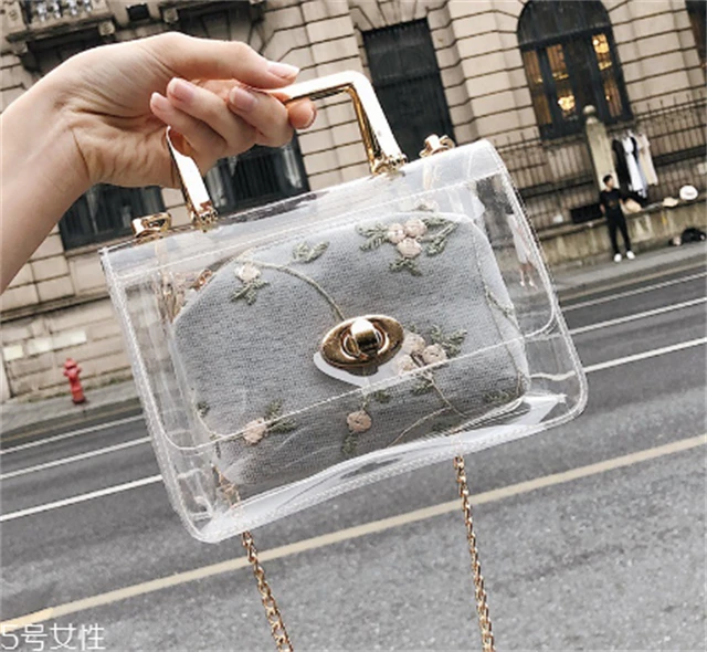 PVC元素:说到2018年春夏最火的时髦元素,PVC材质绝对可以说是当之无愧的主角啊!只有有了点点PVC元素,整个造型都会变得很不一般。以至于现如今,倘若身上若是没有点透明元素,时髦人可能都不敢出门了。时尚流行的果冻包包,相当的深受小仙女们的喜爱,外面是透明的材质,带来清凉时尚感,与线条优美的包身搭配更突,很有光泽的五金链条肩带增加了耐用程度。