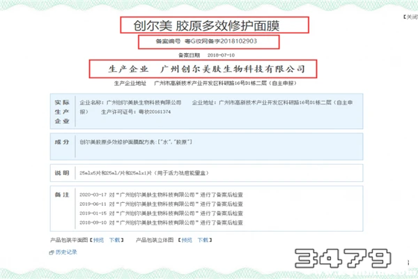 1、创尔美面膜还是比较可信的,旗下的面膜有在国家药品监督局备案,其批准文号与实际出售的面膜的批准文号是一致的。以这款“创尔美 胶原多效修护面膜”为例。其批准文号是“粤G妆网备字2018102903”。具体如图: