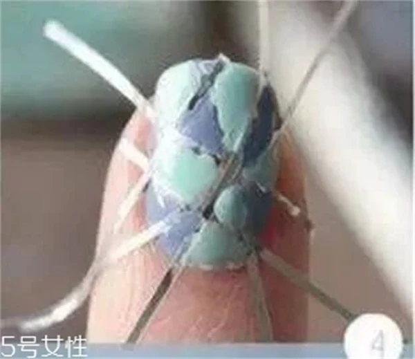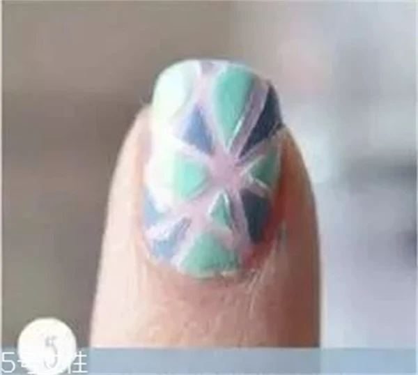 Step4 在分割出来的几何图案上涂上天蓝色和水绿色指甲油,几何上的颜色可以按照自己的喜欢来选择涂抹。