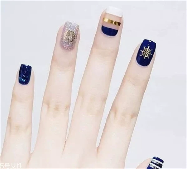 海军风的美甲也非常适合清新的春天吗,而且蓝色的美甲也会显得手很白哦。