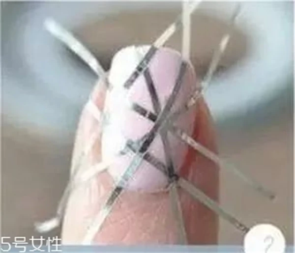 Step2 剪出五六条细细的银色小贴纸。等指甲油干透后任意的贴在指甲上,将指甲分割成许多不规则的几何形状。