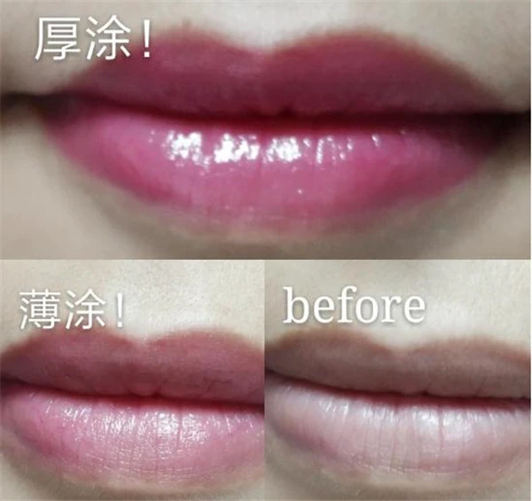 涂唇釉之前,大家可以看到,我的嘴唇你非常没有气色,就跟大病初愈一样。但是薄涂之后,感觉红润美丽了不少,厚涂则更加让人惊喜,色彩饱和度超级强,厚涂之后水水润润的,真的让人仍不住想亲一口,我个人感觉这只唇釉厚涂能够使嘴唇更佳丰盈,使用效果更佳。