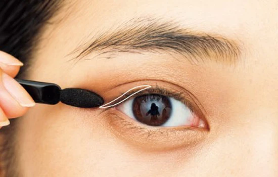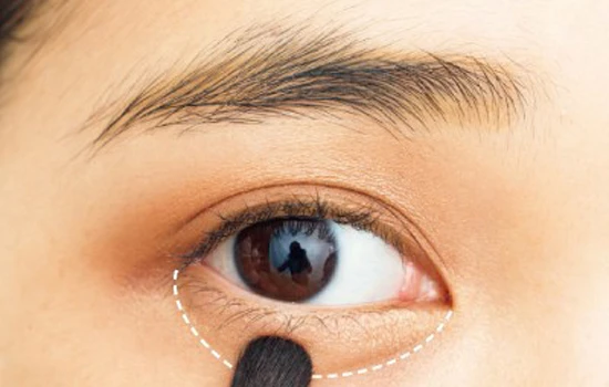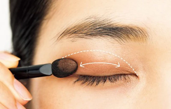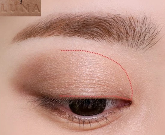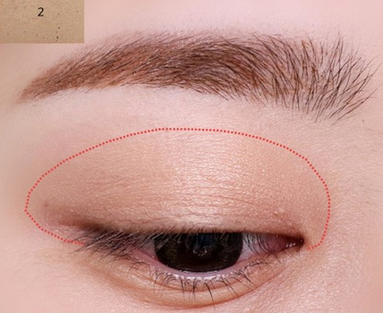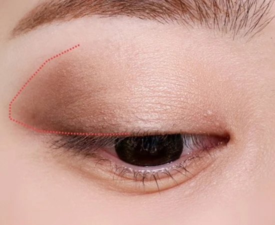 第一步:先用哑光米白色眼影按照虚线面积铺开作为眼皮提亮,增加光泽度。