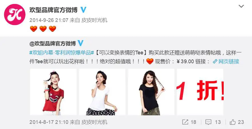 资料显示,“欢型”定位的受众是20-40岁的时尚女性,会“紧跟国际流行,掌握青春时尚元素”,“诠释出都市女性如诗般的气质和如水般的柔情”(参见百度百科)。产品主要为帽子和T恤,价格在百元上下。