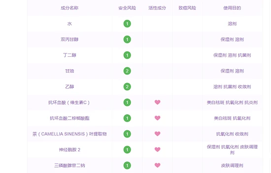 黛珂植物韵律保湿水含有水、双丙甘醇、丁二醇、甘油、乙醇、抗坏血酸(维生素C)、抗坏血酸二棕榈酸酯、茶(CAMELLIA SINENSIS)叶提取物、神经酰胺 2、三磷酸腺苷二钠等成分。