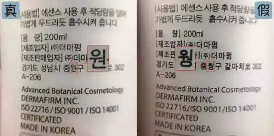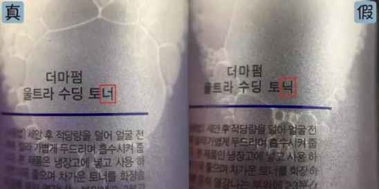 先看紫苏水背面的韩文说明,在第二行的最后一个字,真假两款产品是不一样的两个字体。
