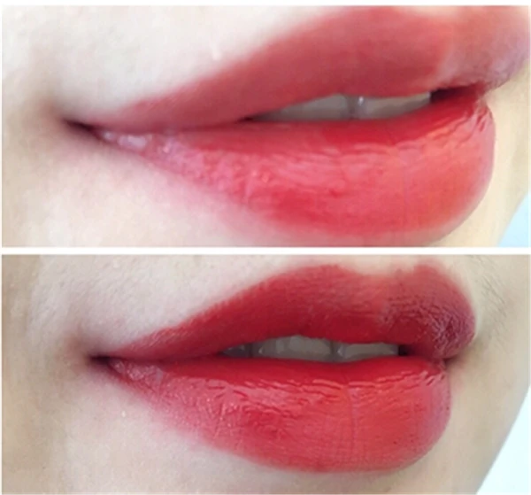 这个颜色是砖红色和土南瓜色之间的一种颜色,砖红色色调更强,带一点时下流行的土南瓜色。更加复古,饱和度很好。显白不挑皮,黄皮白皮都可以使用的一个颜色。质地非常水润,如同它的名字一样唇釉质地,但是比唇釉好涂多了,不会涂不均匀,后续也不会干。