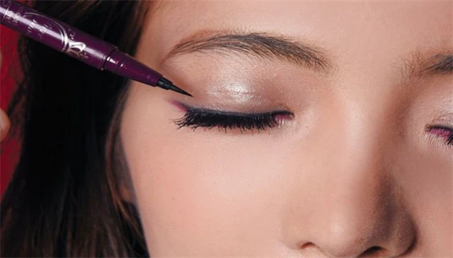先在贴近上眼睑睫毛根部从内眼角至外眼角画出眼线;然后眼睛向上看并用眼线笔分成三段由外眼向内眼中央描绘出下眼线;在外眼角三分之一处开始向上扩展与上眼尾连接呈现一个小小的三角形并将眼尾稍稍上翘拉长;最后用棉签对眼线进行修饰晕染即可。