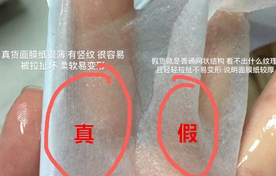 真货面膜纸很薄,有明显的竖纹,很容易被拉扯坏,柔软易变形,而假货面膜纸较厚,是普通网状结构,看不出什么纹理,且不易拉扯变形。
