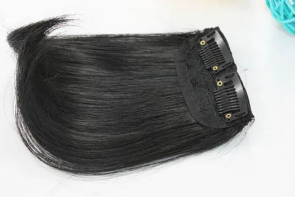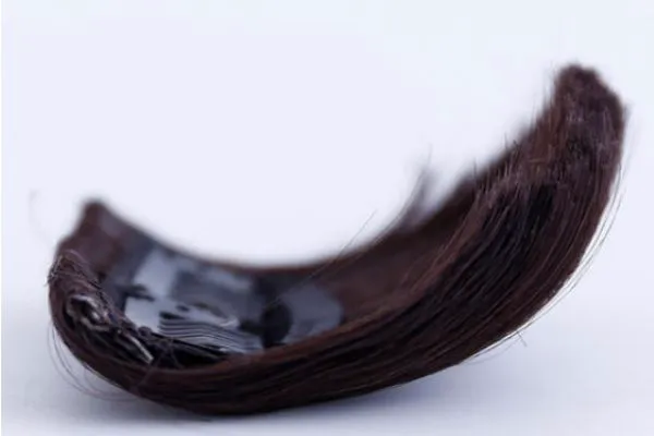 第三步:先把自己需要垫发位置的头发,上层的头发夹起来一部分,下层留下一部分头发,然后把垫发片和下层的头发固定在一起,并且把垫发片的夹子按紧。