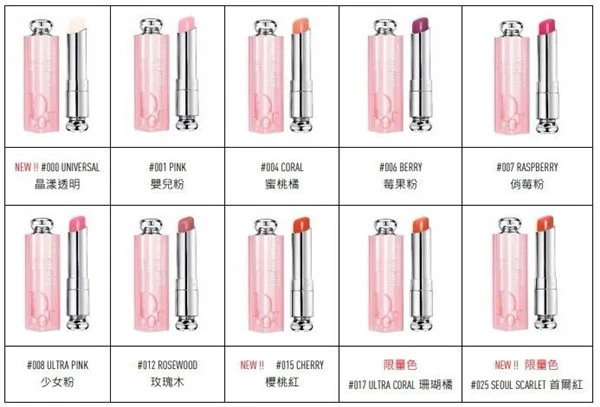 全新迪奥粉漾润唇膏共推出10款色选,为双唇打造宛如天生的自然柔嫩色泽。包含适合所有唇色,增加双唇自然粉嫩度,最经典的#001婴儿粉、活泼俏丽的#004蜜桃橘、最显白的#006莓果粉、低调柔美的#012玫瑰木外,今年更推出2款限量色:迪奥全球彩妆大使智秀钟爱、在韩国一公布即造成韩妞疯狂,蓄势待发准备开抢,亦有智秀红之称的#025首尔红;以及限量色选#017珊瑚橘。此外,迪奥首度打破男女界线,推出第一款透明色选#000晶漾透明,满足男女所有需求,连充满男子气概的男性都上瘾!