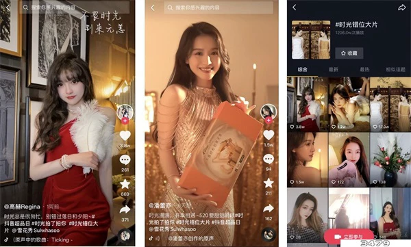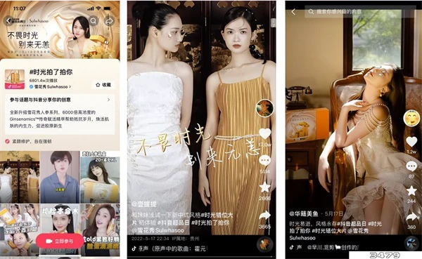 其次,为与用户进一步达成有效沟通,拉近用户距离,抖音电商超级品牌日同时还基于主题及热榜话题,定制了能够更好对主题进行诠释及渗透的挑战赛玩法——#时光错位大片 变装挑战赛。以金色调和珍珠元素体现品牌辨识度,以操作性强的玩法保持其可复制性,并基于对当下“新中式”、“大牌变装”等流行热点的洞察对挑战赛方向进行灵活变通。抖音电商超级品牌日从内容到形式将品牌语言具象化、social化、趣味化。以达人+KOC吸引更多用户参与,让雪花秀的品牌调性变得更有体感,在与用户成功对话的基础上释放雪花秀品牌调性。#时光错位大片 挑战赛邀请17位女性KOC参与,揽获浏览量超1202万。此次合作的变装达人个人属性时尚、视频风格精美,其粉丝受众刚好覆盖年轻、精致爱美的新中产女性这一精准的品牌目标人群,激发了潜在用户对挑战赛和品牌的了解兴趣。
