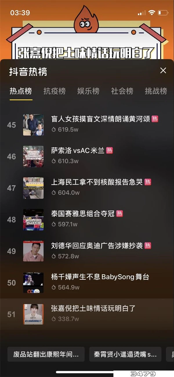 在活动bigday之前,抖音电商超级品牌日面向目标人群进行了专项运营,于抖音平台发布短视频及TopLive广告投放,提前引导大家关注品牌自播间。直播期间,结合张嘉倪直播当晚互动亮点,站内打造双话题#被张嘉倪的520wink鲨到了 、#张嘉倪把土味情话玩明白了 ,利用张嘉倪的明星光环及5.20节日热度,以强娱乐内容抢占网友视线,助力话题曝光增长,最终登上抖音热榜。