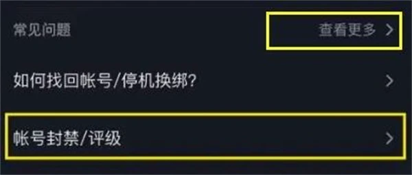 3、在常见问题点击“账号封禁/评级”,或在点击“查看更多”进行选择;