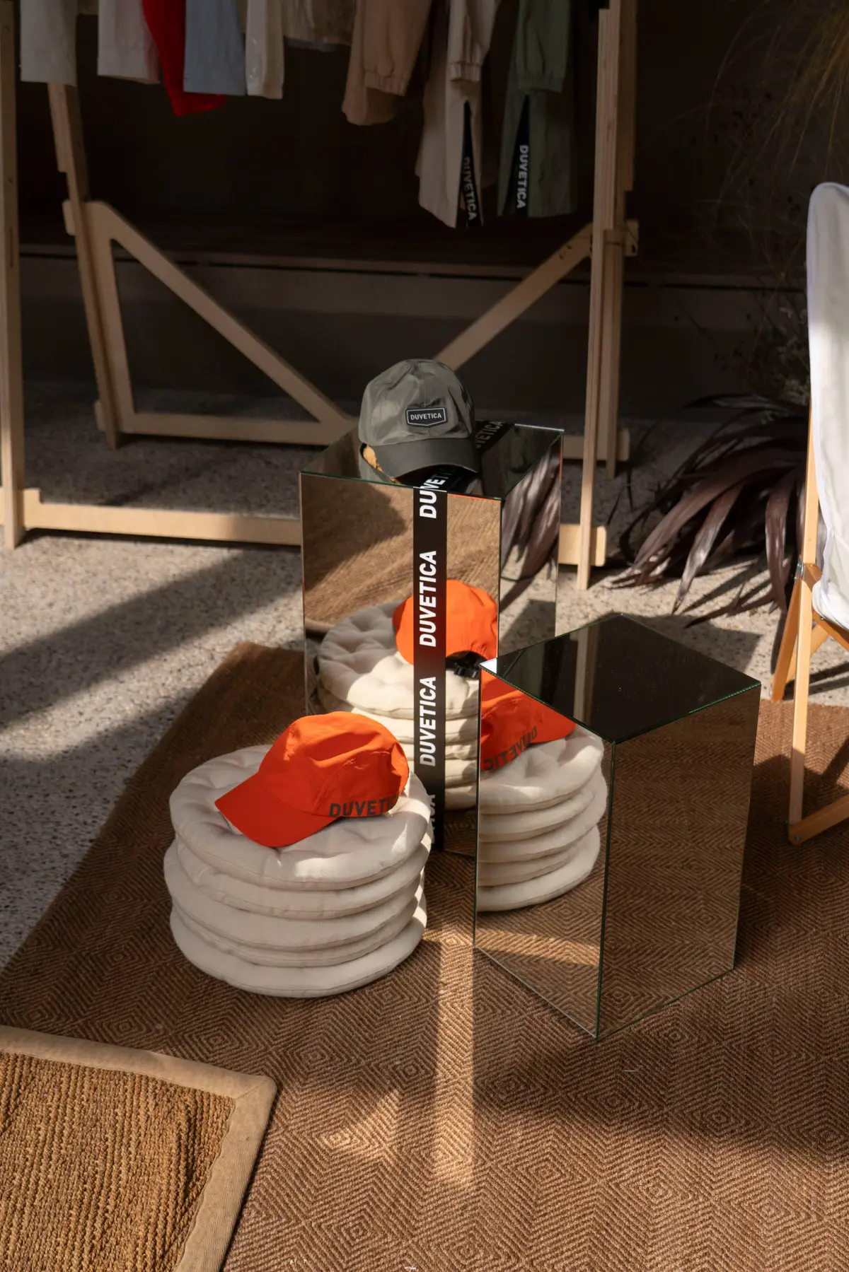 观者沿环形小径步入现场,便置身于由DUVETICA构筑的以品牌意式高端户外美学为核心的露营之地。现场整体呈以米白色系布置,以温润原木作为陈列框架,全新2024春夏新品置身其中,与自然交映成趣,巧妙演绎与自然共生的精致户外风尚。镜面装置贯穿整场静态展,引自然之影于场地之中,产生时尚与自然的奇妙碰撞,彰显DUVETICA所传达的高端时尚户外生活方式,引领探索人与自然和谐共生的时尚课题。