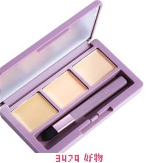 3、然后使用遮瑕盘进行遮瑕。尔木葡遮瑕盘中分为3种颜色,咖色主要用于有痘印的地方,橘粉色用于修饰黑眼圈和泪沟,米色用于修饰暗沉,起到提亮肤色的效果。