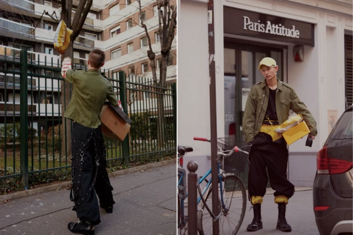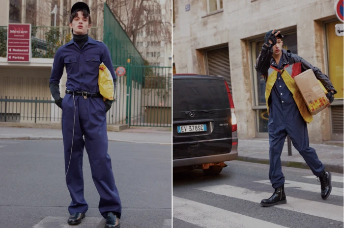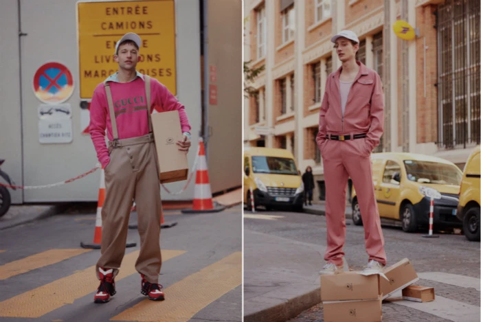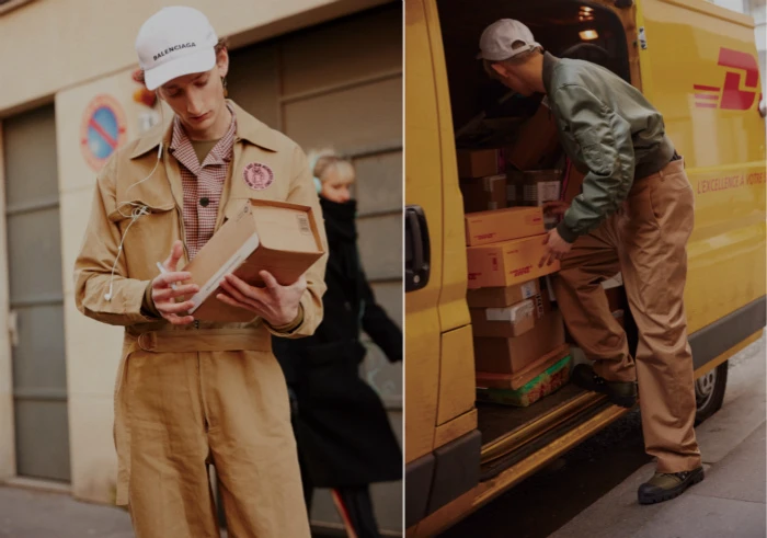 模特身着Balenciaga、Gucci等奢侈品牌,像真正的快递员一样融入生活场景中,将“职人时尚”演绎得淋漓尽致!