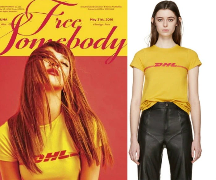 左边:韩国女子组合F(X)成员Luna曾经身着Vetements的DHL T恤,配着暖光和迷离的眼神,很有感觉。右边是模特的“官方演绎”。