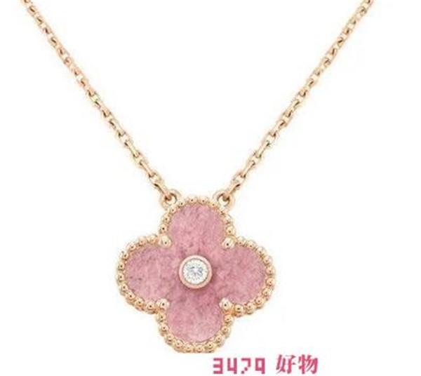 梵克雅宝2021圣诞限量款中链子是18k玫瑰金,一侧链条上有金属吊牌、小号Hallmark扣,另一侧链条则有两枚调节扣,尾环上还压有防伪钢印。四叶草椰子是用蔷薇辉石,也就是粉晶,经过打磨抛光之后呈现斑斓的少女粉色泽,非常的漂亮,大大满足了人们的少女情怀。正中点缀了一颗5分、vvs净度的钻石。
