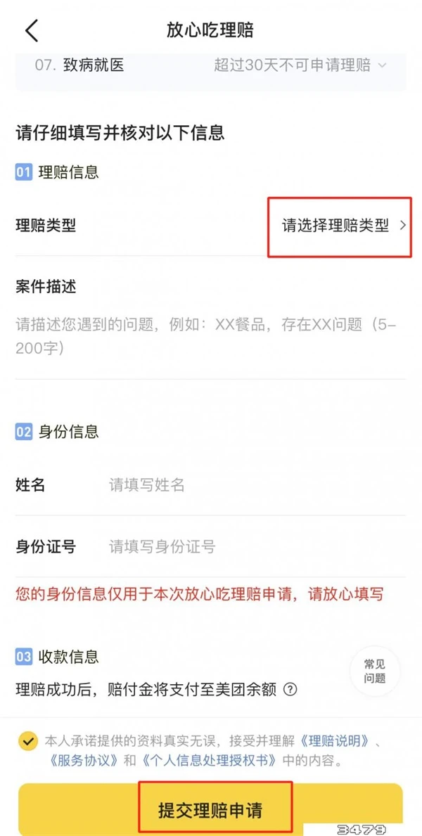 3、在放心吃理赔页面,根据自己的实际情况填写相关信息,最后点击【提交理赔申请】即可。