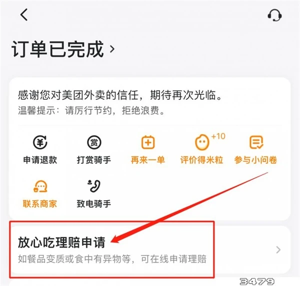2、在订单页面中间找到【放心吃理赔申请】,点击进入;