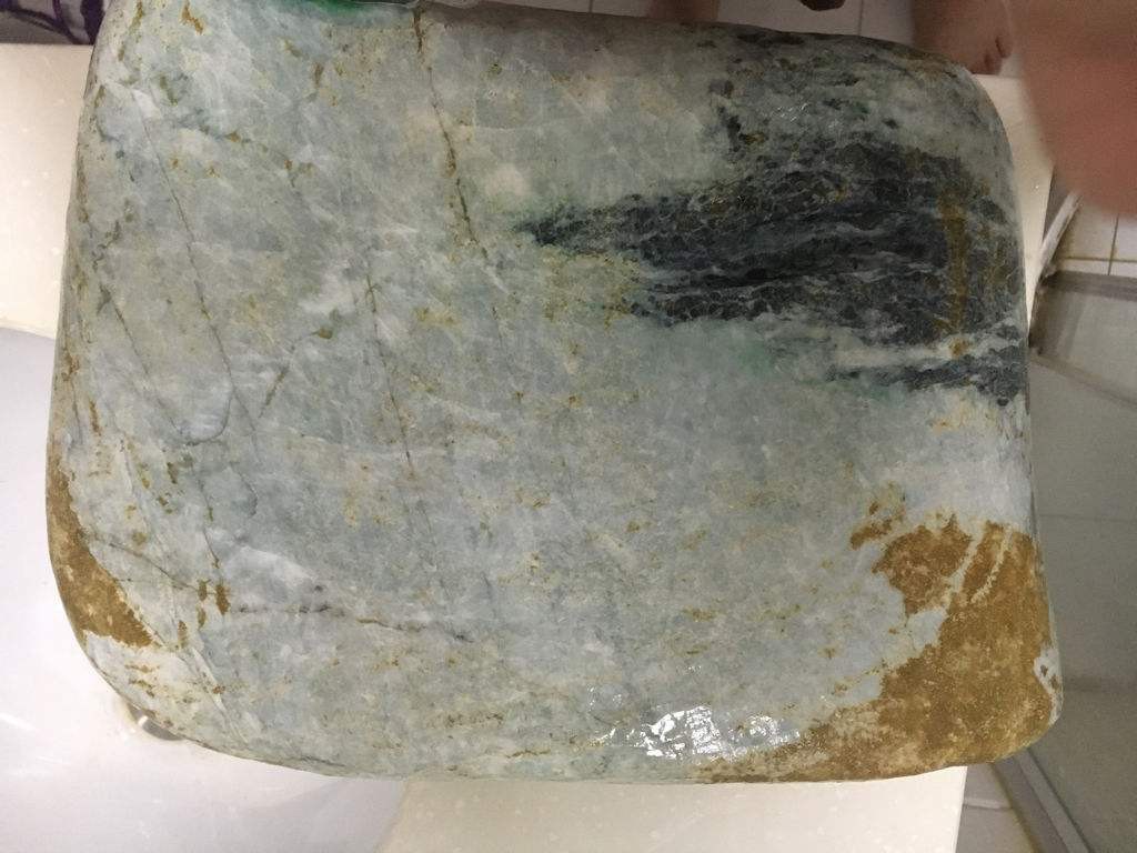 2、挖脏。去皮后翡翠赌石仍会有少量皮上杂质深嵌入玉肉内,须用各种形状的磨头将其磨掉。挖掉的标准就是:看见滴水呈现纯白色,磨头感觉吃力。