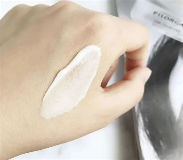 按压出来的质地是奶黄色的乳状,属于比较轻盈无负担的类型,后续很好推开,使用感比较清爽,凑近闻有菲洛嘉招牌的清新花香,闻着很放松