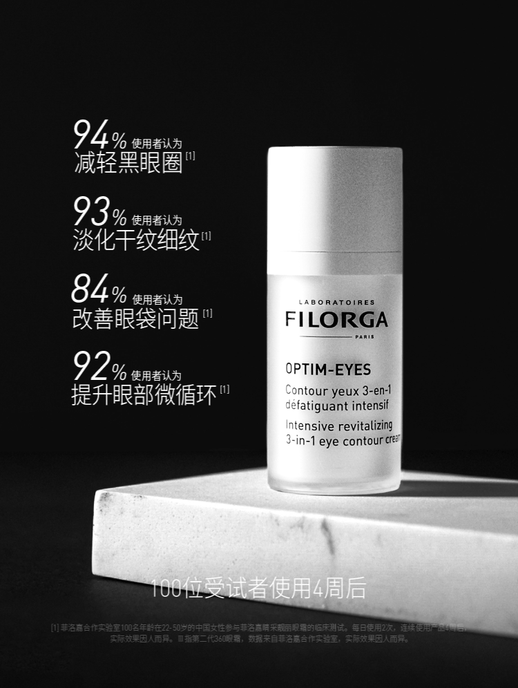 菲洛嘉(Filorga)靓丽眼霜,集中针对眼周细纹,皱纹,眼袋和黑眼圈的护理,重新雕塑眼部周围肌肤,摆脱疲态。消除黑眼圈、抗浮肿、360°祛除眼部细纹、重塑眼部轮廓。能深层重建修复眼周肌肤。质地清爽,不用担心会长脂肪粒,针对眼周疲劳并且有各种问题的肌肤。