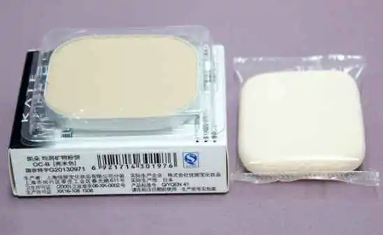 第一步:粉底液、遮瑕后,粉扑沾取适量粉饼,上脸前稍微抖一下,抖掉上面的余粉。