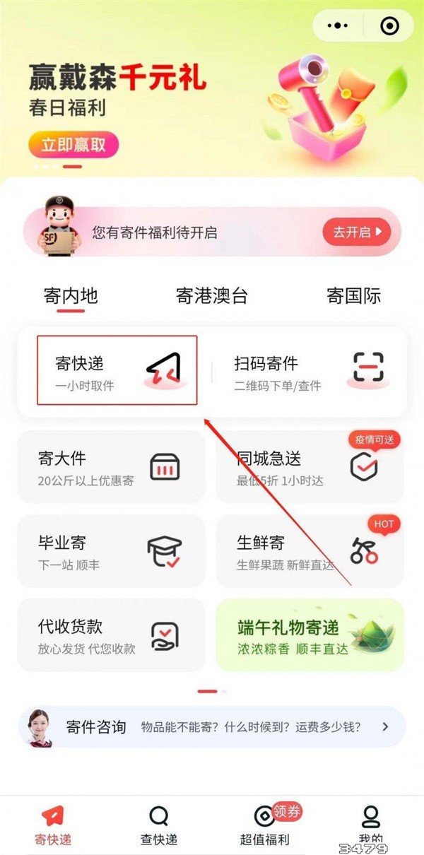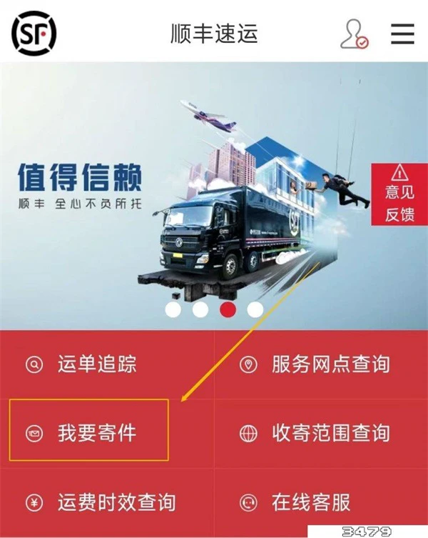 2、完成登录并返回至顺丰官网首页后,在显示页面中找到并选择“我要寄件”选项;
