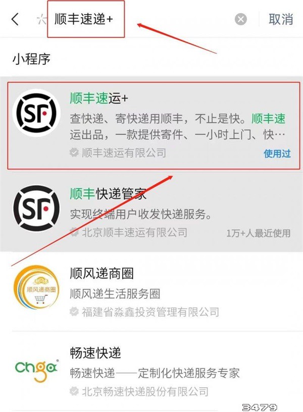 1、打开进入【微信】,下拉页面,在搜索栏内输入【顺丰速运+】,找到后点击“顺丰速运+”小程序;