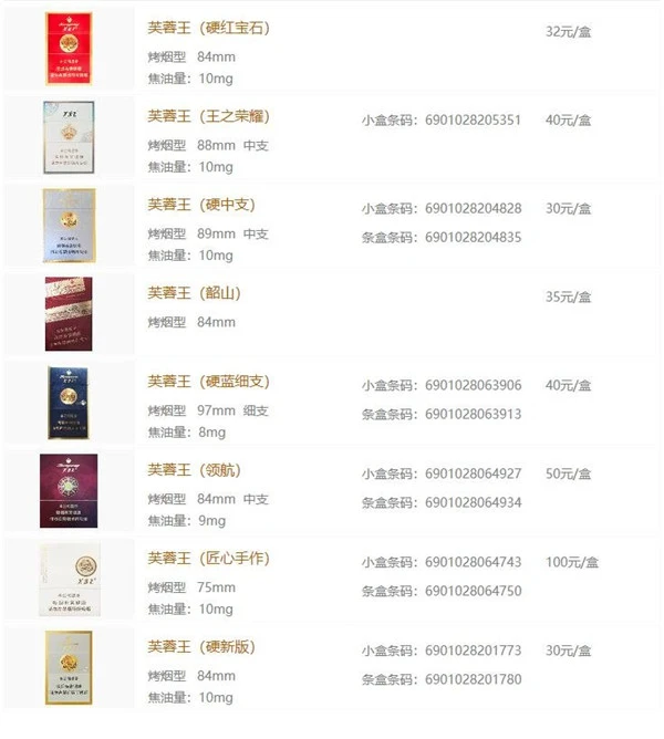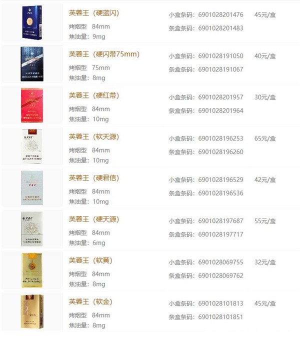 所有芙蓉王烟价格表图片与价位