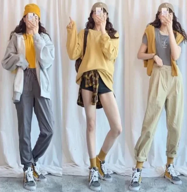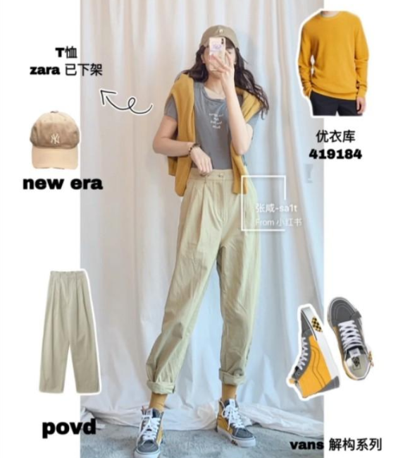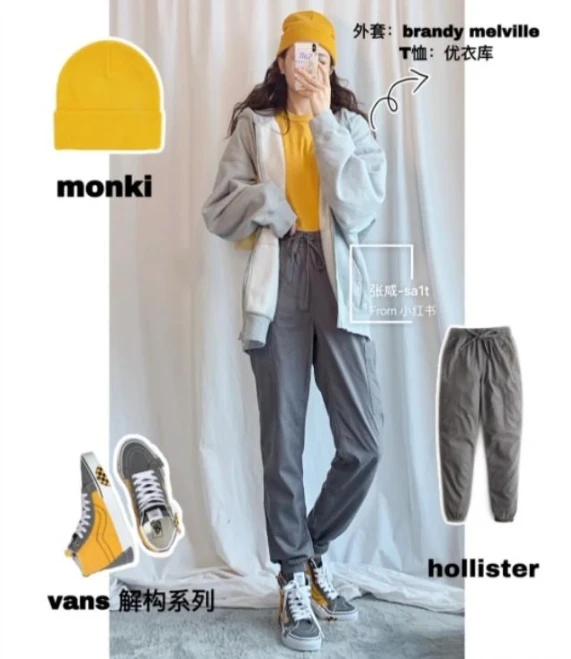 春季难免早晚温差大,这时就可以选择一件外套,中午时热的时候方便随时脱下。短袖是选择了黄色的亮色系,而裤子选择了深色的暗色,同时等黄色的短袖和黄色的针织帽也是一个色系的颜色。整体穿搭更加和谐。