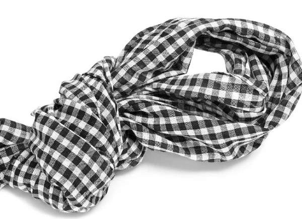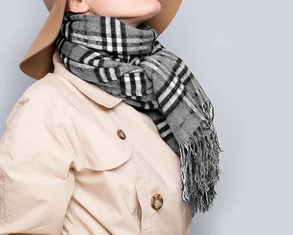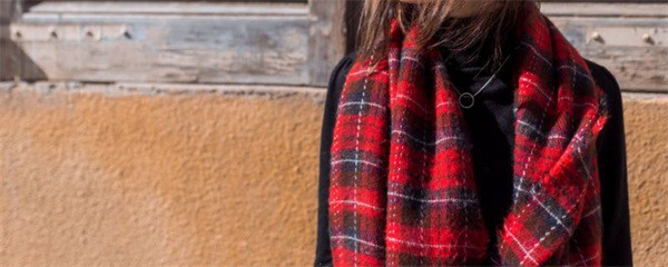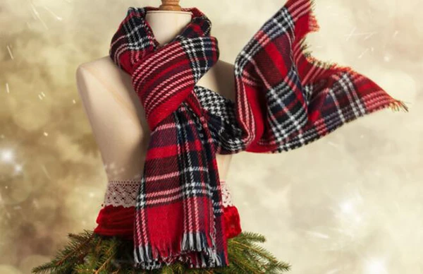 黑白格子围巾搭配驼色上衣、白色裤子和尖头高跟鞋,红色格子围巾搭配工装款大衣、破洞牛仔裤和短靴,黑白格子围巾搭配皮衣、格纹连衣裙和短靴,红色格纹围巾搭配机车外套、牛仔裤、中筒马丁靴。