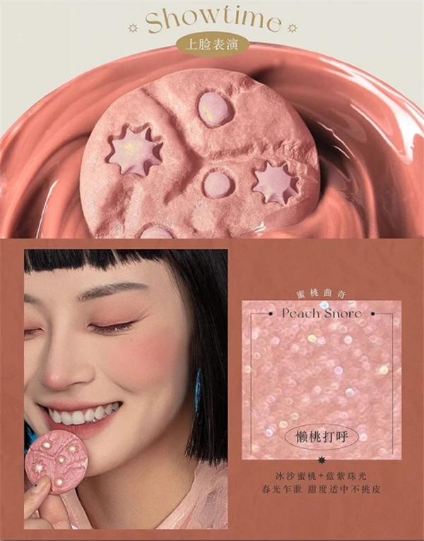形同曲奇的腮红灵感来源于芝麻街里的曲奇饼,首创采用冷萃和真空循环的高科技打造曲奇质地,而且曲奇上凹凸不平的点缀还能使它同时起到高光和腮红的作用。