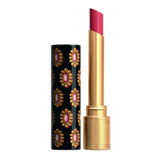 Gucci 倾色琉光唇膏的配方以玻尿酸、果油、花卉萃取精油为基底,有效滋润双唇并赋予饱和水润色彩。它注入了奢华而高滋润度的黑玫瑰精油、牡丹花卉萃取精油,并结合荷荷巴籽油和乳木果油,带来长时间的滋润效果。唇膏中所添加的玻尿酸不但能实时提供保湿功能,使用时亦为双唇缔造丰盈和顺滑效果。