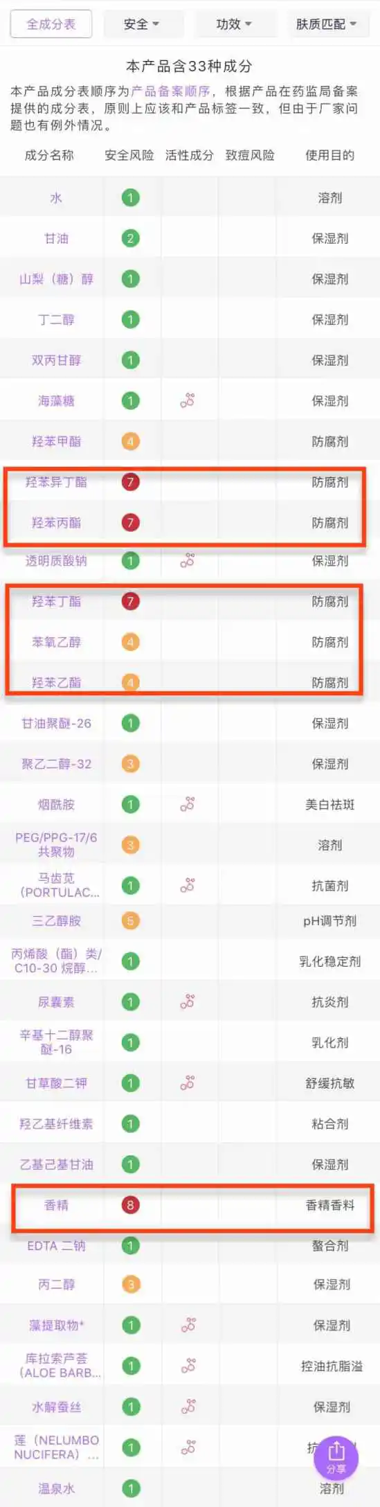 从它的成分表看来,里面含有的防腐剂实在是不少,也有香精成分,所以敏感肌还是要慎用。它里面也含有一定的活性成分,补水保湿效果比较好。
