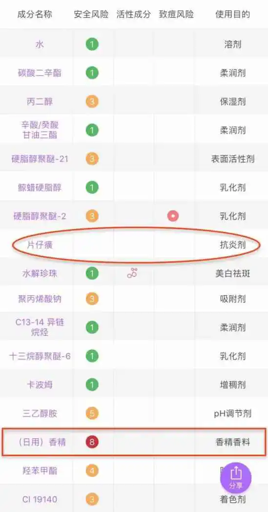 片仔癀是一种专利中药成分,据说有消炎杀菌、活血化瘀的作用,从成分表来看,片仔癀也确实是在比较前的位置,说明不是随便说说的噱头。