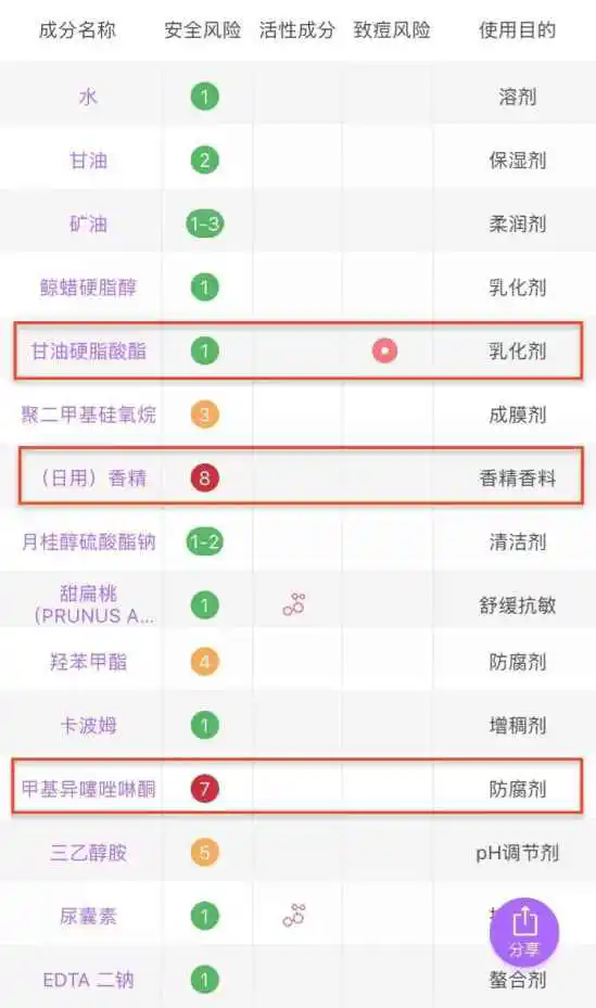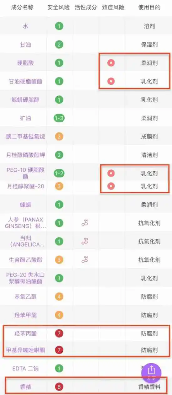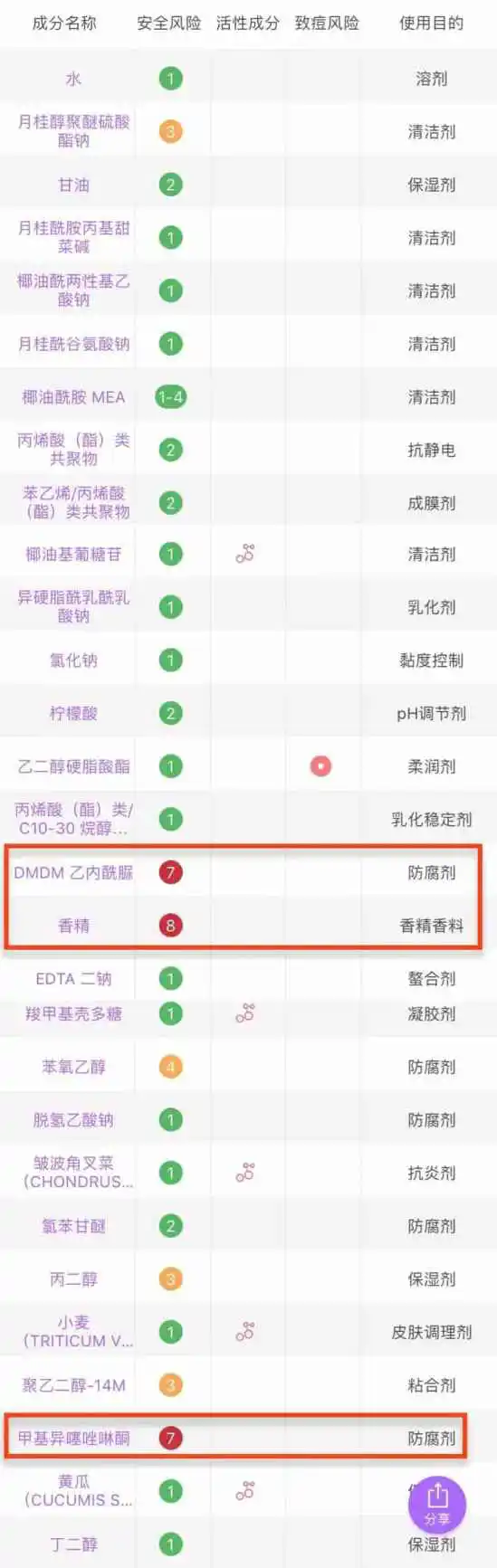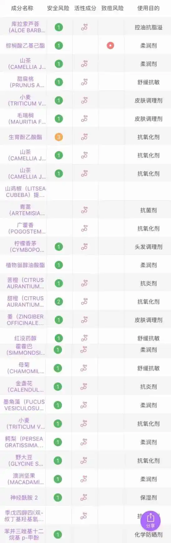 除了有一个防腐剂和香精的危险系数比较高以及一个容易致痘的乳化剂成分之外,其他成分都算比较安全。