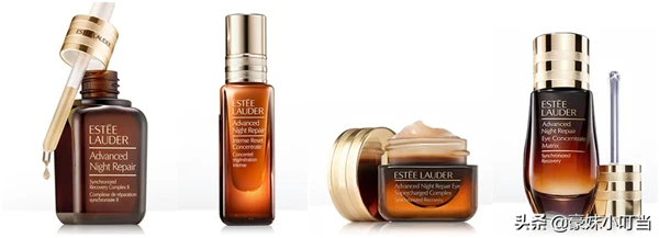 ※ 雅诗兰黛小棕瓶是一个系列来的,大名其实是特润修护系列,棕色包装瓶的主要产品有以下四种,从左到右分别是小棕瓶精华,高能小棕瓶精华,抗蓝光眼霜和二合一的眼精华。我们就从左到右一个一个来扒扒。