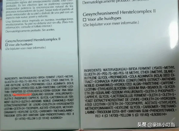 雅诗兰黛小棕瓶系列之所以说在抗老的产品中非常地能打,是因为它含有两种非常厉害的抗老成分,一种是二裂酵母发酵物,这个也是个人尽皆知的成分了,它的老对头兰蔻小黑瓶同样是主打这个成分的;另一种则是雅诗兰黛的专利成分——三肽-32,这就是今天的重点了。亚洲版本的小棕瓶精华全部都是英版的,也就是made in UK,全部,你没看错,是全部都没有这个成分,只有made in USA的美版才有这个专利成分。下图是小编分别从美国和国内免税店购买的小棕瓶精华,可以看成分表对比,其中画着红色线的TRIPEPTIDE-32 就是这个三肽-32了,右边的免税店的英版是没有的。