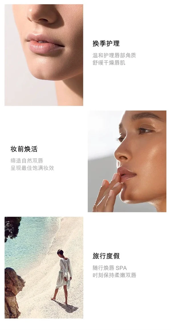 细致焕唇-温柔褪去角质,回复自然唇色,柔软润养-滋润柔软双唇,预防唇部粗糙及干燥.丰润加乘-如同唇膜般舒适,呵护唇部,有助于后续唇部保养和上妆.
