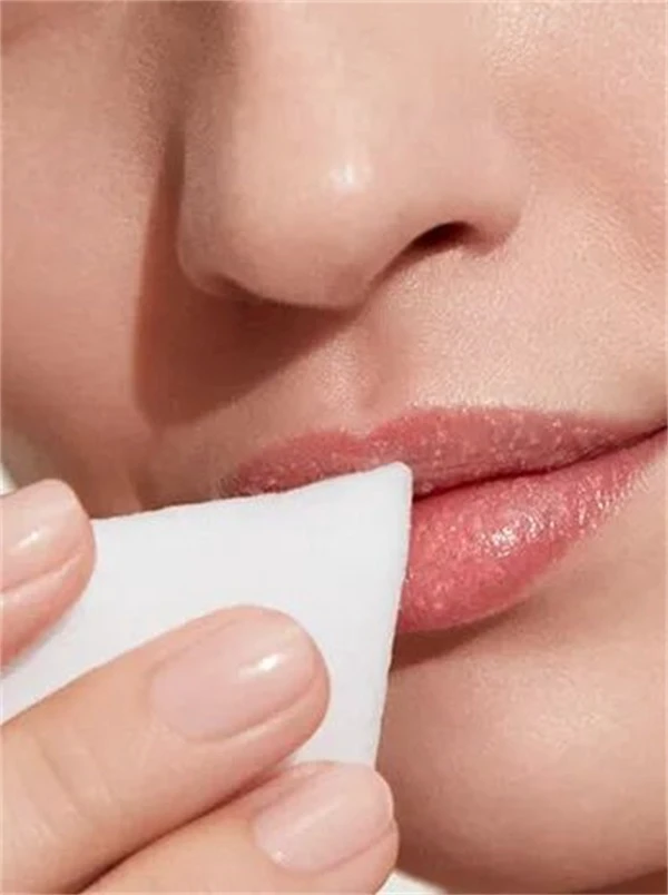 使用棉片轻柔擦去唇部多余的膏体,迎接新生饱满双唇