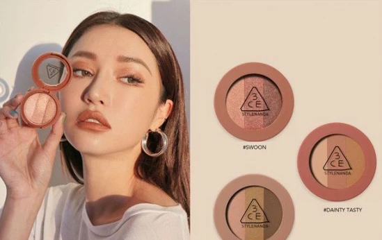 此款精心设计配色的三色眼影组,相当推荐不太会替眼影配色的新手购入,尤以偏暗的橘色调#Swoon来说更适合任何肤色的女生;摸起来带有丝绒感的柔软质地用来堆叠色彩不易结块,虽然有点小飞粉但不影响其显色度,但以韩国开架彩妆来说,此款眼影价格偏高。