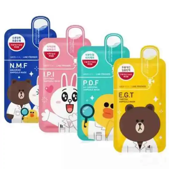 蓝色的布朗熊和妮可兔NMF面膜主打超强补水保湿;粉色的妮可兔IPI面膜主打提亮肤色,恢复皮肤光泽;黄色的布朗熊EGT面膜主打集中抗皱,改善肌肤弹力。